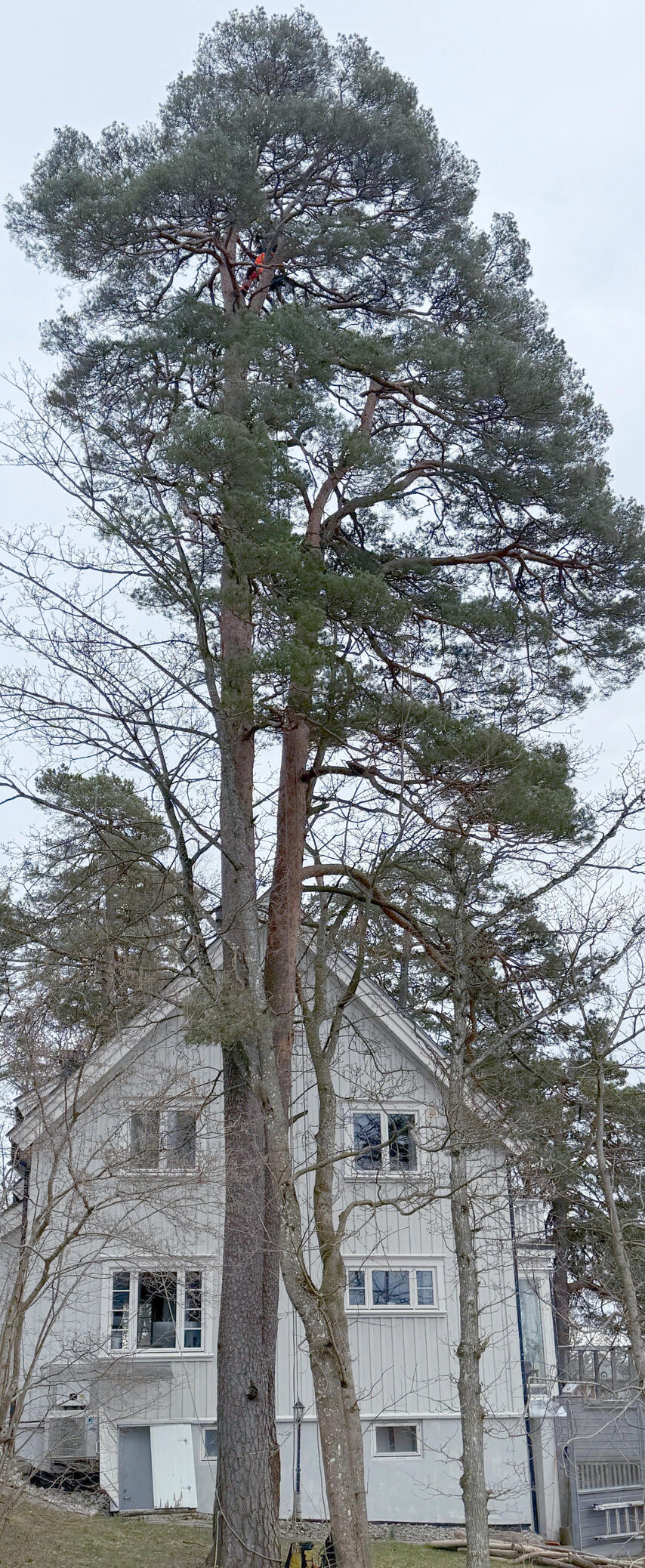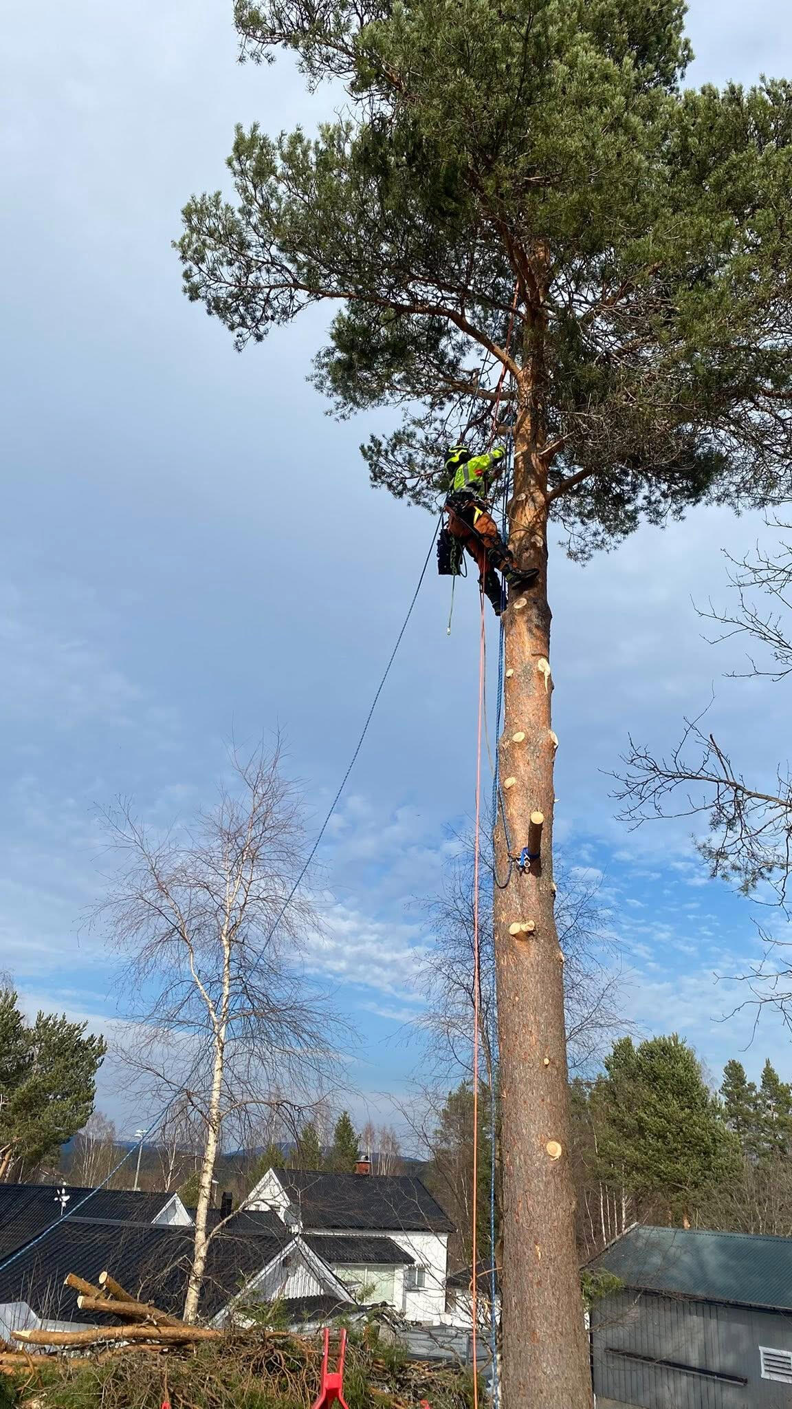 Prosjektet var å få ned 2 furuer som sto ca 8m fra husvegg. Begge trær ble tatt ned gren for gren og så kappet stykkevis ned i 2-4m lengder. I samme moment ble vi bedt om å ta ned et lønnetre, det ble tatt ned på samme måte. Alle 3 trærne ble kappet opp i 30cm stykker, huseier ønsket å kløyve det selv