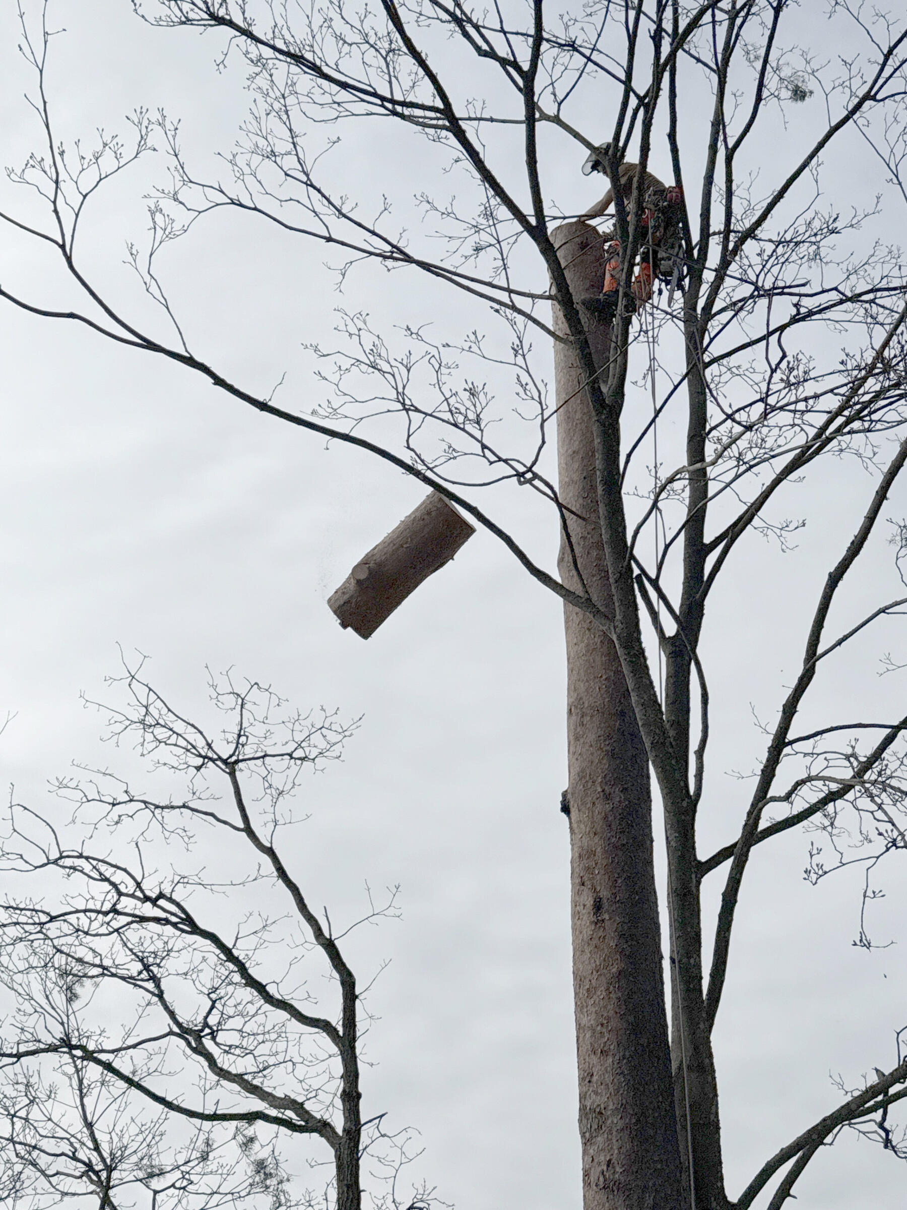 Prosjektet var å få ned 2 furuer som sto ca 8m fra husvegg. Begge trær ble tatt ned gren for gren og så kappet stykkevis ned i 2-4m lengder. I samme moment ble vi bedt om å ta ned et lønnetre, det ble tatt ned på samme måte. Alle 3 trærne ble kappet opp i 30cm stykker, huseier ønsket å kløyve det selv